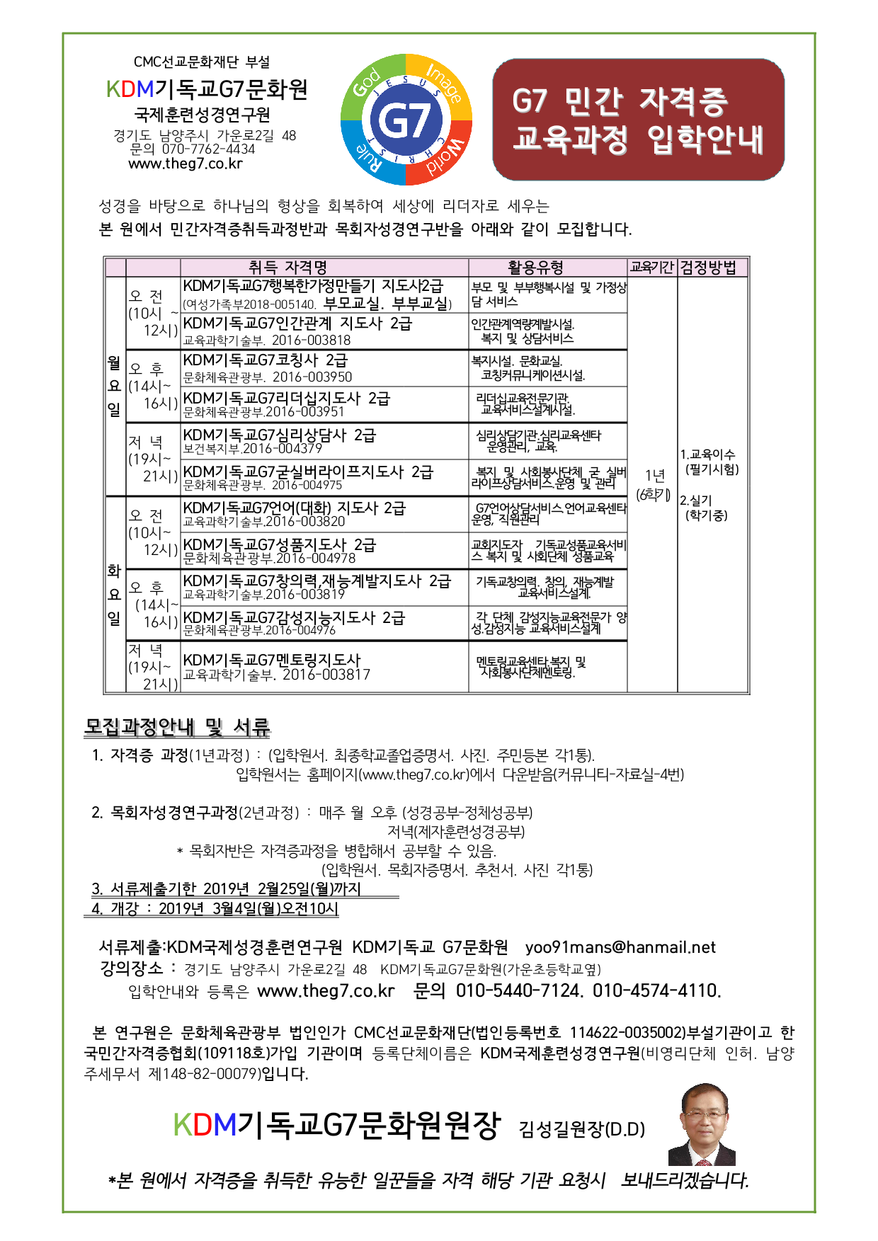 2019년도 G7문화원 자격증및 목회자성경연구반 모집공고